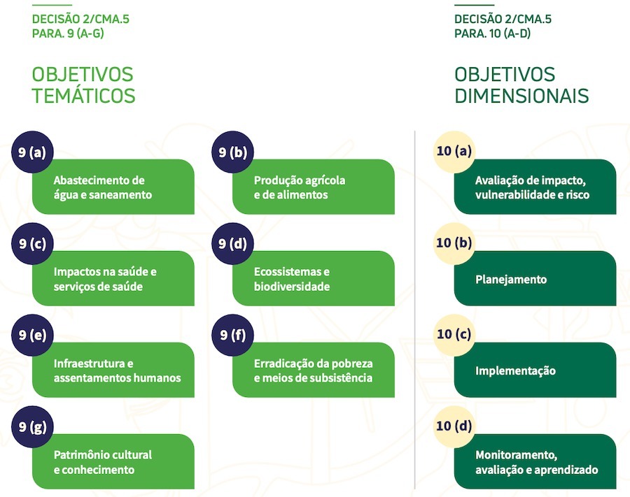 A aprovação, na COP28, do Framework dos Emirados Árabes Unidos para a Resiliência Climática Global (UAE Framework for Global Climate Resilience) representou um marco para a implementação da meta global de adaptação. A estrutura define áreas prioritárias que demandam ações de adaptação em escala global e estabelece, além de objetivos temáticos, objetivos dimensionais que devem orientar os países na elaboração e implementação de seus NAPs.
